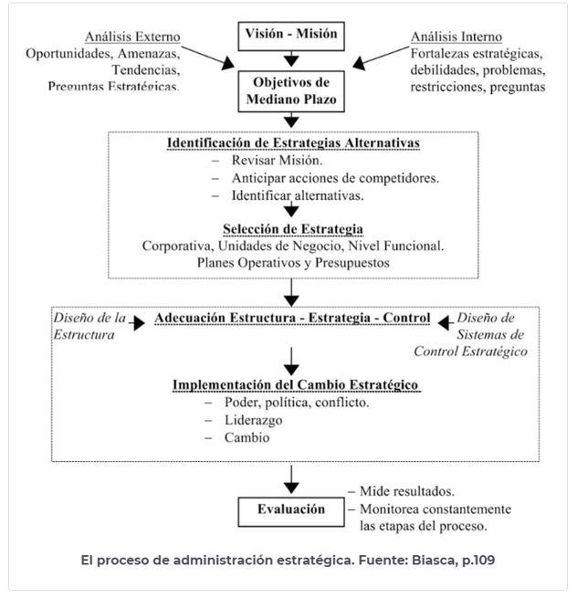 En la figura del libro ¿Somos competitivos? de R. Biasca se presenta una propuesta que condensa el proceso de administración estratégica: