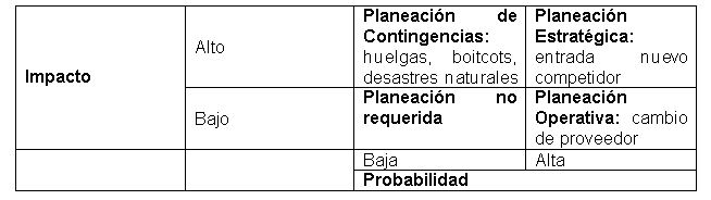 a. Anticipar contingencias por impacto y probabilidad. Se identifican mediante la matriz impacto-probabilidad descrita en el cuadro. El plan de contingencias abarca acciones de baja probabilidad y alto impacto. Las situaciones de alta probabilidad se planean como estrategia u operación.