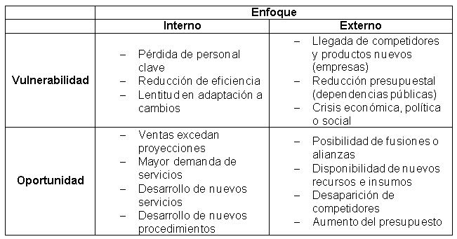 b. Elaborar la matriz del Plan de Contingencias por Vulnerabilidad y Oportunidad. Deben establecerse puntos activadores o críticos para identificar de inmediato el advenimiento de una contingencia. Suelen ser indicadores de productividad, financieros o comerciales, internos y externos. Deben considerarse las contingencias surgidas dentro de la organización o factores externos de vulnerabilidad (peligros) o de oportunidad.