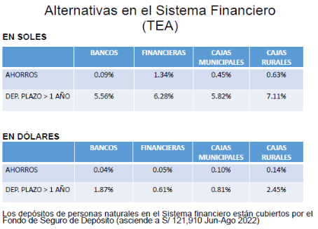 Los depósitos a plazo fijo son el mejor instrumento de ahorro en el sistema financiero. Por ello, es importante tomar en cuenta las tasas de interés que ofrecen los bancos, las financieras y las cajas municipales y rurales para los ahorros en soles y dólares, como puede observarse en los siguientes cuadros: