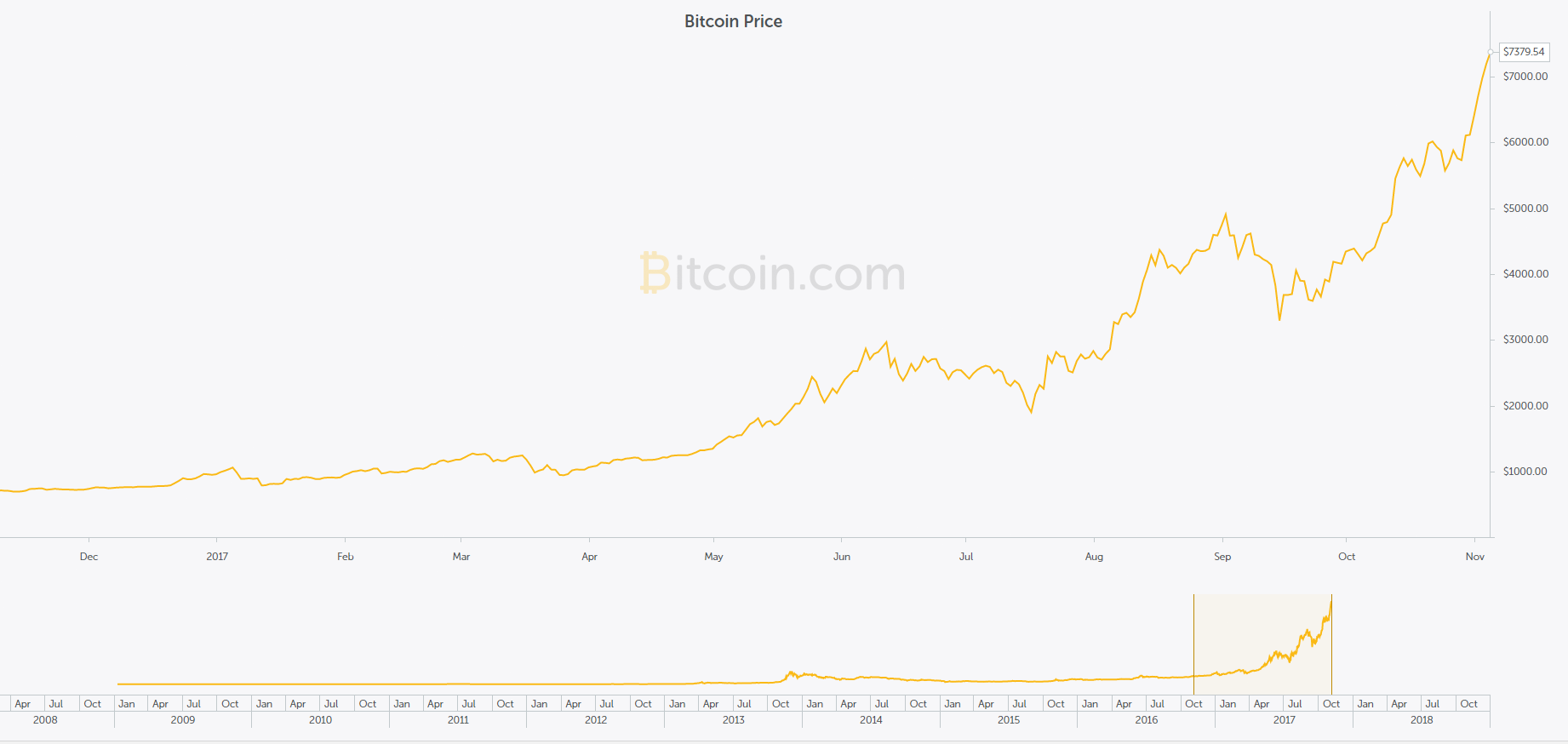 En junio, el bitcoin ya cotizaba en 2 000 dólares y tres meses después superaba los 4 000 dólares, es decir, 100 % de ganancia en tres meses. Aunque algunas noticias alarmaron a los inversionistas, como las dudas que expresaron gobiernos como China, la promesa de rentabilidad rápida fue más fuerte y al 6 de noviembre el precio alcanzó los 7 379.54 dólares.