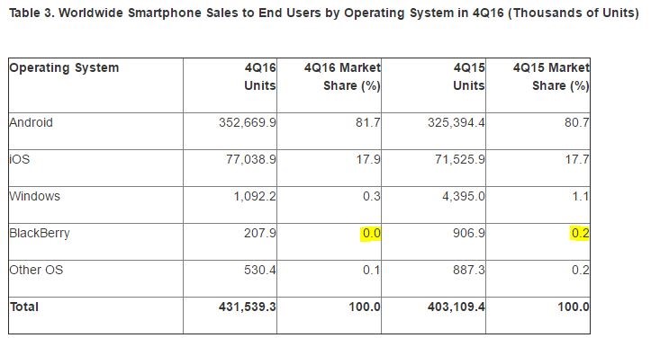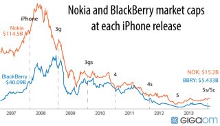 BlackBerry y Nokia dominaron el sector con facilidad hasta la irrupción de Apple y Google, que modificaron las cuotas del mercado para cada marca. Tras el lanzamiento del iPhone, BlackBerry demostró una respuesta lenta y obsoleta con los fallidos modelos Z10 y Storm, que solo trataban de emular la tendencia de Apple con su móvil: pantallas táctiles y más grandes. En el 2017, su presencia ya era nula, según Gartner.
