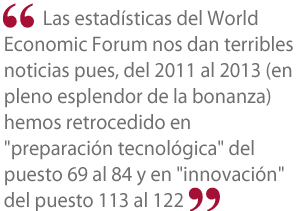 Como lo comentara el profesor David Ritchie en sus excelentes artículos sobre el retroceso tecnológico del Perú, las estadísticas del World Economic Forum nos dan terribles noticias pues, del 2011 al 2013 (en pleno esplendor de la bonanza) hemos retrocedido en "preparación tecnológica" del puesto 69 al 84 y en "innovación" del puesto 113 al 122.
