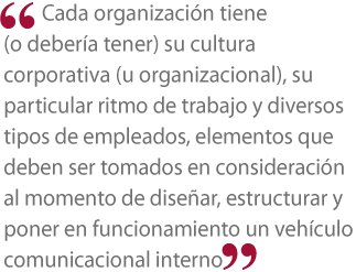 Cada organización tiene (o debería tener) su cultura corporativa (u organizacional), su particular ritmo de trabajo y diversos tipos de empleados, elementos que deben ser tomados en consideración al momento de diseñar, estructurar y poner en funcionamiento un vehículo comunicacional interno.