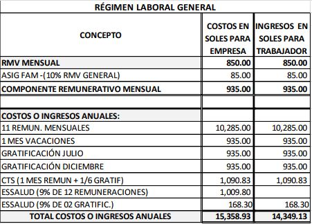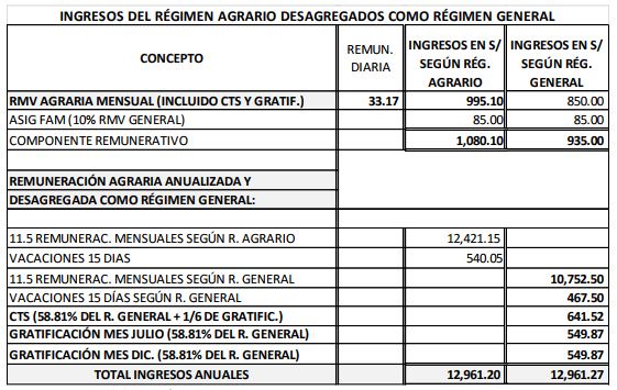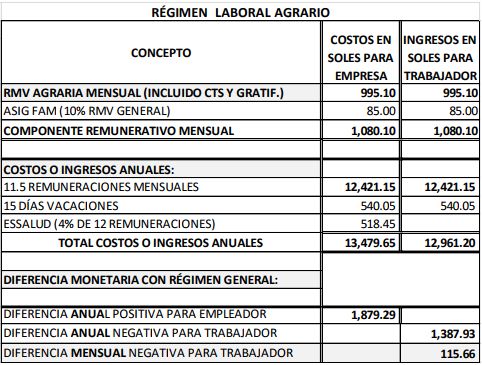 Al anualizarse los ingresos de los trabajadores de ambos regímenes, se observa que cada trabajador agrario deja de percibir 1 388 soles anuales o 116 soles mensuales en comparación con lo que perciben los del régimen común, además de solo gozar con 15 días de vacaciones. Asimismo, en contraposición, los empleadores agrarios tienen el incentivo de un ahorro anual equivalente a 1 879 soles por trabajador y el costo de 15 días de vacaciones que no se otorgan, sin mencionar el incentivo del impuesto a la renta. Estos montos no incorporan, en ambos sentidos, el beneficio o costo que tiene el dinero por CTS y gratificaciones, al darse en el sector agrario el disfrute de su pago desde el primer día o mes del año.