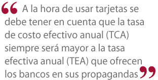 "A la hora de usar tarjetas se debe tener en cuenta que la tasa de costo efectivo anual (TCA) siempre será mayor a la tasa efectiva anual (TEA) que ofrecen los bancos en sus propagandas", señala.