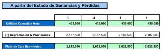 Es importante notar que no se está considerando servicio de deuda, dado que nuevamente insistimos que se está buscando encontrar el valor económico de los activos para luego afectarlo por la Deuda. Entonces, se encuentra un Flujo de Caja Económico de $ 2´622,550 que se obtendrá en el negocio analizado. Estos mismos resultados podrían obtenerse a partir del Estado de Ganancias y Pérdidas como se muestra en el cuadro adjunto, donde si a la Utilidad Neta Operativa se le suma la Depreciación se obtiene el mismo Flujo de Caja Económico de $ 2´622,550.