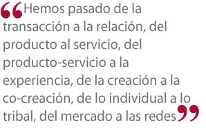 En otras palabras, podríamos decir que hemos pasado de la transacción a la relación, del producto al servicio, del producto-servicio a la experiencia, de la creación a la co-creación, de lo individual a lo tribal, del mercado a las redes (Bucci, 2006).