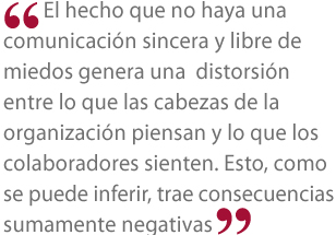 El hecho que no haya una comunicación sincera y libre de miedos genera una distorsión entre lo que las cabezas de la organización piensan y lo que los colaboradores sienten. Esto, como se puede inferir, trae consecuencias sumamente negativas en el sentido de que las jefaturas o gerencias no conocen qué pasa realmente en la base de la empresa que manejan. Asimismo, los jefes no saben qué consecuencias tienen sus indicaciones sobre la gente a su cargo.