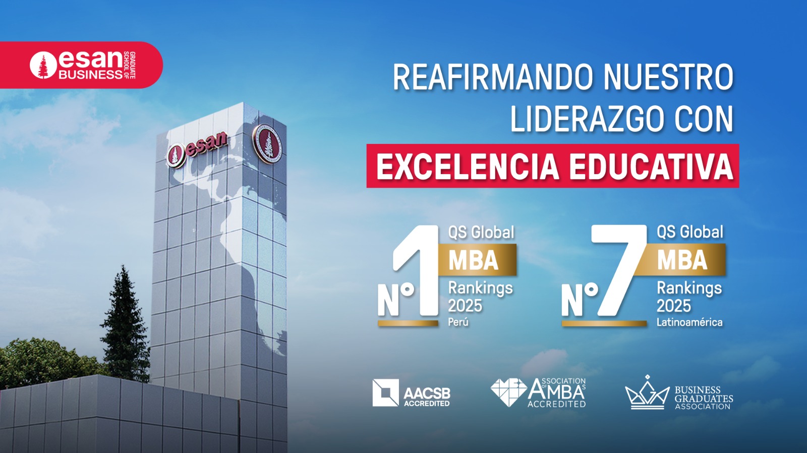 El MBA de ESAN fue nuevamente considerado como el número uno del Perú en el QS Global MBA Rankings 2025 publicado por la prestigiosa empresa británica Quacquarelli Symonds, líder mundial en análisis de información del sector educativo superior. La Escuela de Negocios también ocupó el séptimo lugar en América Latina y destacó por el Retorno de la Inversión, Empleabilidad, Trayectoria de sus graduados y emprendimientos, así como Diversidad.