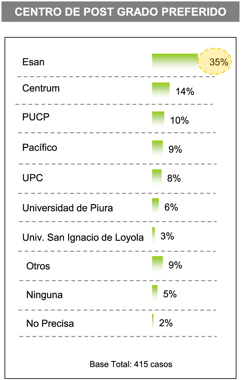 Del 67% de los ejecutivos encuestados que cuenta con MBA, un 20% lo ha cursado en ESAN liderando la preferencia por 9 puntos porcentuales respecto a la segunda opción. El 33% de los ejecutivos investigados que cuentan con maestría y doctorado lo han realizado en ESAN, que triplica la segunda opción de este tipo de servicios educativos de posgrado. De la casi quinta parte de los ejecutivos con maestría, el 16% la ha realizado en ESAN, lo que la presenta como el primer centro estudios de posgrado.