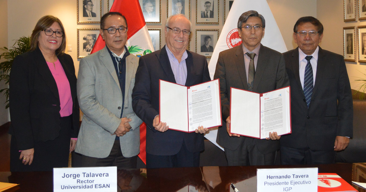 Con el objetivo de beneficiar al Sistema Nacional de Gestión del Riesgo de Desastres (Sinagerd), el Dr. Jorge Talavera, rector de la Universidad ESAN; y el Dr. Hernando Tavera, presidente ejecutivo del Instituto Geofísico del Perú (IGP), firmaron el 14 de setiembre un convenio marco de cooperación interinstitucional.