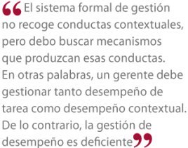 Por ello es importante distinguir entre lo que llamamos desempeño de tarea, conductas típicas de un cargo, y desempeño contextual, conductas que van más allá de la descripción del cargo. Las últimas obviamente no son exigibles. Mal podría yo incluir en una evaluación de desempeño la participación en la fiesta de navidad de mis empleados; es decir, el sistema formal de gestión no recoge conductas contextuales, pero debo buscar mecanismos que produzcan esas conductas. En otras palabras, un gerente debe gestionar tanto desempeño de tarea como desempeño contextual. De lo contrario, la gestión de desempeño es deficiente.