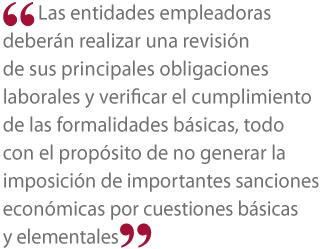 "El procedimiento de inspección tendrá un nuevo perfil. Por lo tanto, las entidades empleadoras deberán realizar una revisión de sus principales obligaciones laborales y verificar el cumplimiento de las formalidades básicas, todo con el propósito de no generar la imposición de importantes sanciones económicas por cuestiones básicas y elementales", señaló.