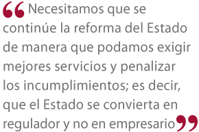 No sigo listando, pero definitivamente necesitamos que se continúe la reforma del Estado de manera que podamos exigir mejores servicios y penalizar los incumplimientos; es decir, que el Estado se convierta en regulador y no en empresario.