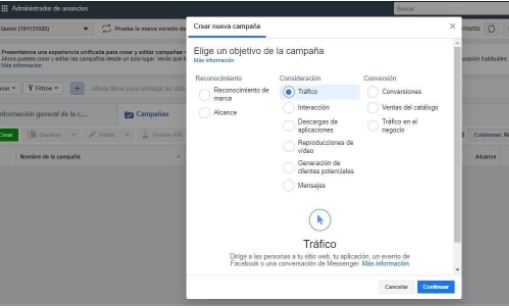 2. Elige el objetivo de tu campaña. Debes tener claro lo que quieres lograr con tus anuncios. La herramienta te muestra 11 objetivos distintos. Por ejemplo, puedes elegir entre generar tráfico a tu sitio web, ganar interacción en una publicación específica de tu fan page o lograr que los usuarios descarguen la aplicación móvil de tu empresa, entre otros.
