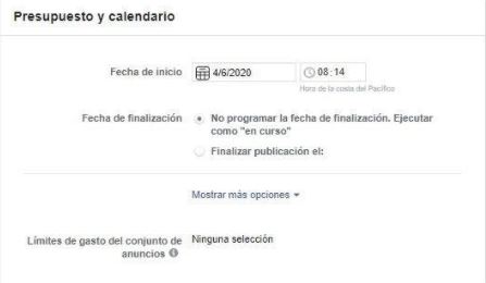 4. Configura tu calendario y audiencia. Después de asignar el presupuesto a invertir, podrás elegir si deseas poner en marcha la campaña ahora mismo o si prefieres elegir una fecha de inicio y finalización. Así, también podrás estimar cuánto gastas si designaste un presupuesto diario para la campaña.
