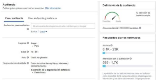 Puedes segmentar a tu audiencia a partir de datos básicos como: rango de edad, sexo y ubicación (país, ciudad o distritos). También puedes hacerlo a partir de datos demográficos, intereses y comportamiento que los usuarios indican en su cuenta de Facebook. Puedes elegir entre datos como nivel de formación académica, carrera profesional, sectores de trabajo, cargos laborales, etc.