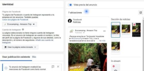 5. Crea tu anuncio. Primero debes elegir la fan page de tu empresa en el apartado "Página de Facebook". Si tu marca cuenta con una cuenta de Instagram, también podrás seleccionarla para que el anuncio también se muestre en esa red.
