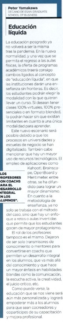 Peter Yamakawa, decano de ESAN Graduate School of Business, analizó para la revista G de Gestión cuál será el futuro de la educación superior a raíz de la pandemia. En esta línea, señaló que en la nueva normalidad los estudiantes podrán elegir la modalidad con la que quieran llevar un curso: si desean tener clases 100 % virtuales, 100 % presenciales o en formato blended.