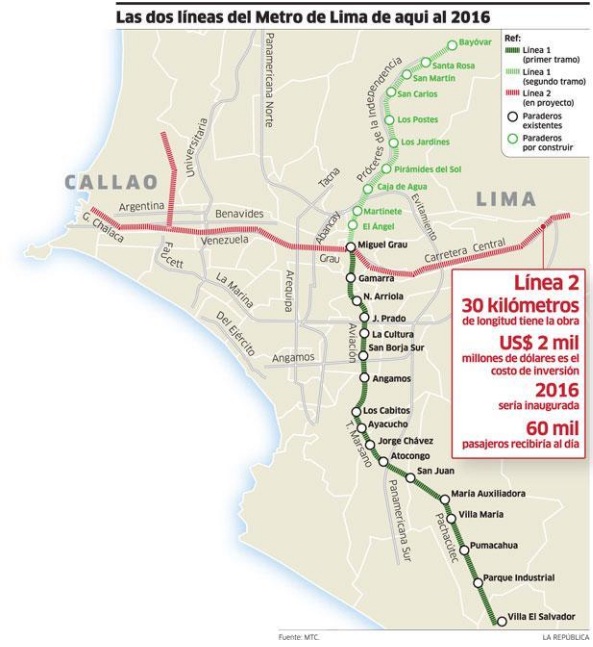 Figura 7: Línea 1 y Proyecto de Línea 2 del Metro de Lima Metropolitana / Fuente: La República