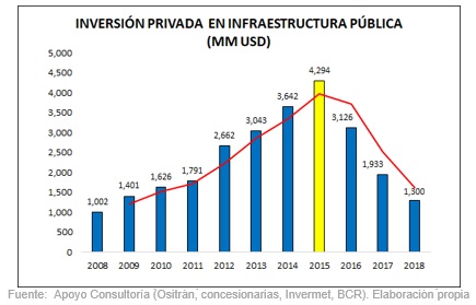 Un estudio del Banco Mundial revela que, por cada 1 % de crecimiento del PBI, los países latinoamericanos requieren invertir un promedio de 1 % en infraestructura pública. En ese sentido, para crecer un 6 %, porcentaje estimado para salir del estancamiento de la renta media , habría que adjudicar e invertir cerca de 6 % del PBI por año, es decir, USD 14 000 millones, cifra que casi duplica lo registrado últimamente en el Perú, según se muestra en el siguiente cuadro:
