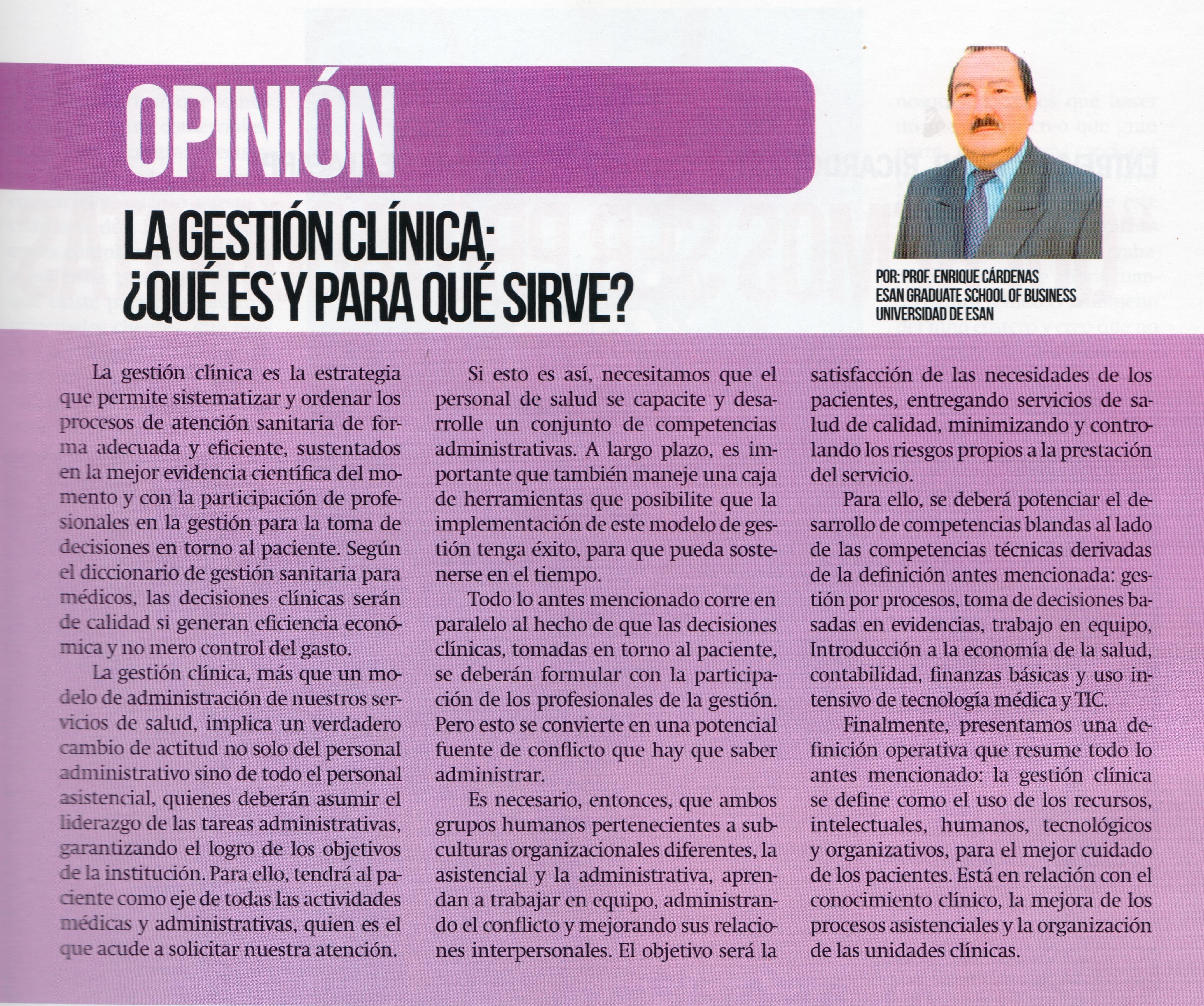 La gestión clínica, más que un modelo de administración de nuestros servicios de salud, implica un verdadero cambio de actitud no solo del personal administrativo, sino de todo el personal asistencial, que deberá asumir el liderazgo de tareas administrativas que garanticen el logro de los objetivos de la institución. Para ello, tendrá al paciente como eje de todas las actividades médicas y administrativas, que es quien acude a solicitar nuestra atención.