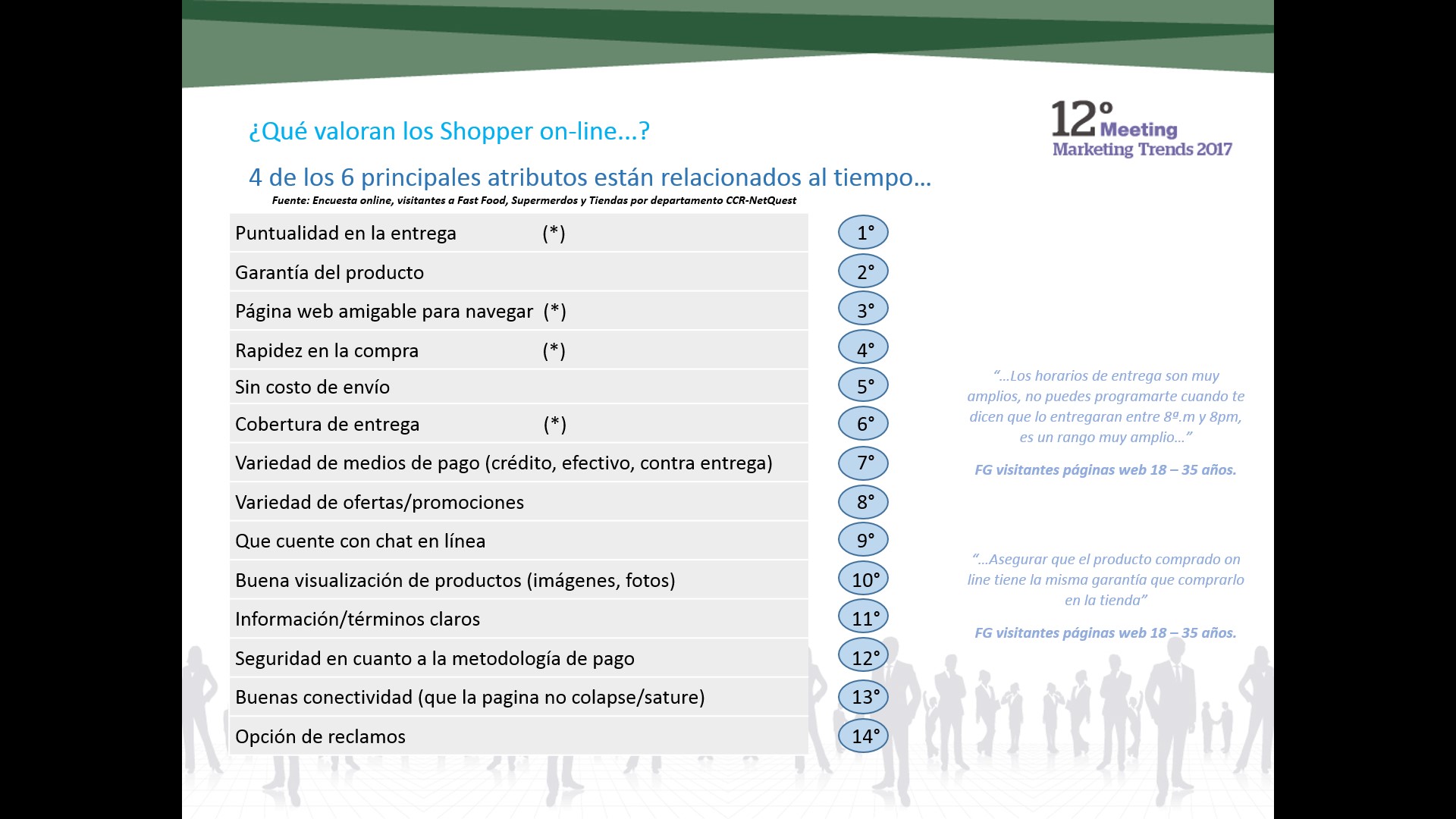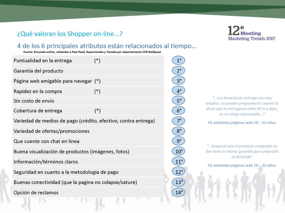 En un reciente estudio realizado por CCR en colaboración con ESAN Graduate School of Business, se identificó que cuatro de los seis atributos más valorados por el shopper online están relacionados con evitar pérdidas de tiempo en la compra. Pero ello no queda allí. La característica más importante para el consumidor, muy por encima de las promociones, es la puntualidad en la entrega.