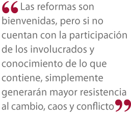 Las reformas son bienvenidas, pero si no cuentan con la participación de los involucrados y conocimiento de lo que contiene, simplemente generarán mayor resistencia al cambio, caos y conflicto.