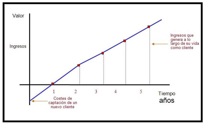 V. Kumar ha llamado al concepto que Alcaide trajo hace 8 años (basado en estudios de F. Reichheld), La Ruta Convencional de la Rentabilidad. La empresa cree que la inversión inicial en captar clientes (nada más veamos las millonarias campañas masivas en TV y prensa) será compensada con creces por clientes que en el tiempo tendrán menor sensibilidad al precio, hablarán bien de la marca y costará menos atenderlos. En resumen, el flujo de ingresos y rentabilidad de clientes crecerá con el tiempo.