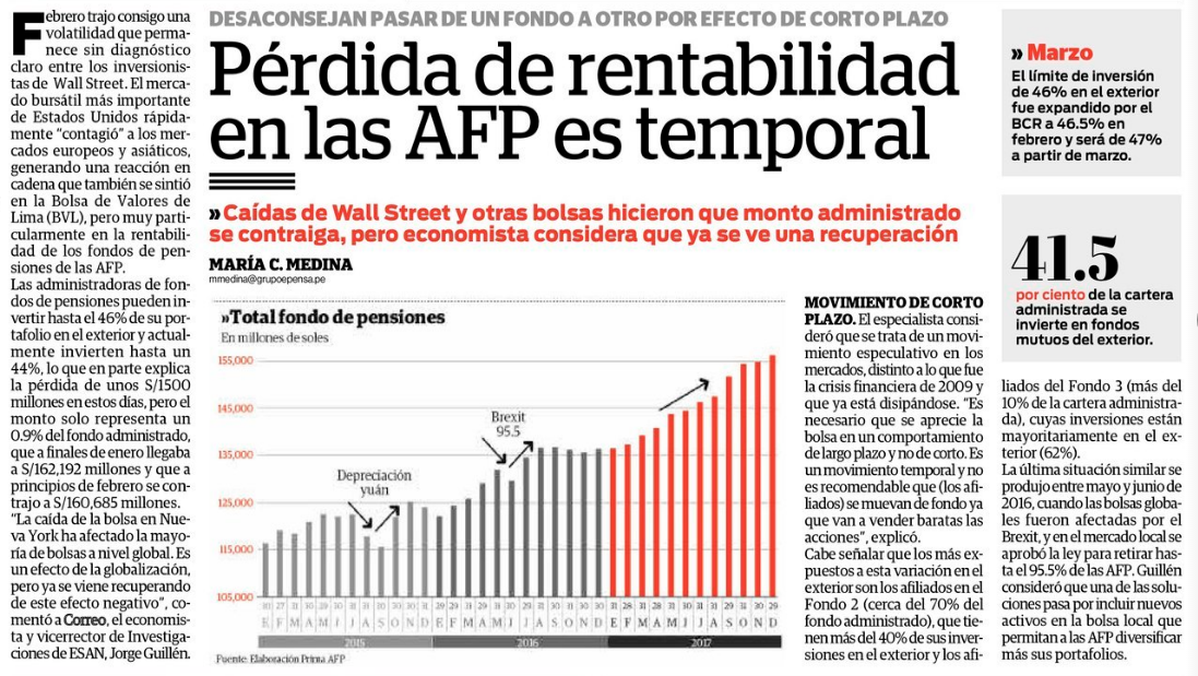 Las administradoras de fondos de pensiones pueden invertir hasta el 46 % de su portafolio en el exterior y actualmente invierten hasta un 44 %, lo que en parte explica la pérdida de unos S/. 1500 millones en estos días. No obstante, el monto solo representa un 0.9 % del fondo administrado, que a finales de enero llegaba a S/. 162, 192 millones, y que a principios de febrero se contrajo a S/. 160, 685 millones.