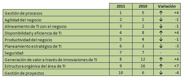 En el primer lugar del ranking 2011 se encuentra la gestión de procesos, ésta subió cuatro posiciones respecto al ranking anterior. Del primer al segundo lugar fue desplazada la búsqueda de agilidad del negocio. Igualmente, del segundo al tercer puesto pasó el alineamiento de TI con el negocio.
