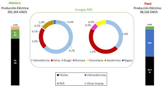 La matriz eléctrica de México es poco diversificada, ya que depende fuertemente de los combustibles fósiles, por otro lado, en la matriz eléctrica de Perú hay una presencia importante de energía hidroeléctrica y también de combustibles fósiles, principalmente gas. A pesar de que ambos países destinan porcentajes similares de energía a los sectores industriales, comerciales, residenciales y otros, son el tamaño de la economía y de la población los que definen la diferencia en los volúmenes de producción, México produce 391 TW/h y Perú 48 TW/h.