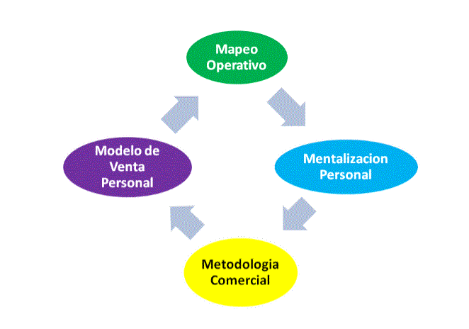 • Metodología comercial: implica la necesidad de adoptar un orden y un método para desarrollar el trabajo de campo, combinando las etapas de la venta (preventa, venta y postventa) con las del servicio (captación, satisfacción, lealtad y desgaste). Además, se debe tener claro que "fallar en el planeamiento, es planear la falla".
