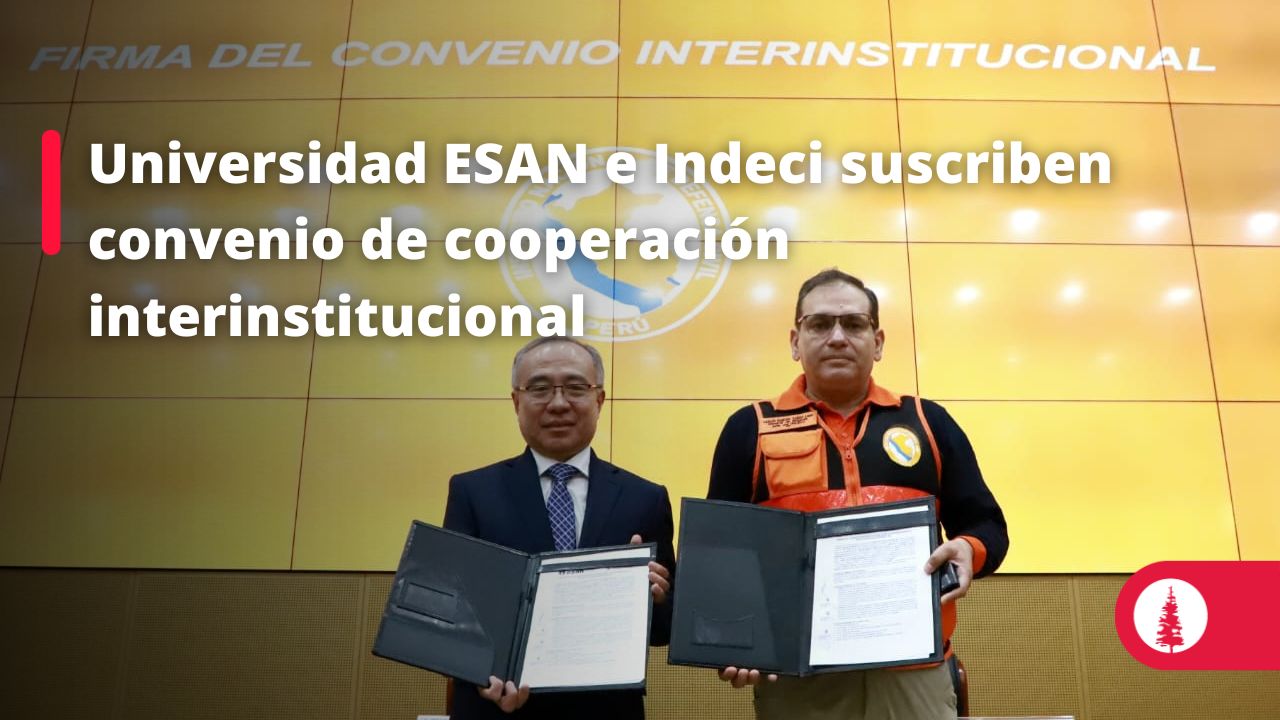 El pasado 5 de mayo, Jaime Serida, rector de la Universidad ESAN, y el Gral. Brig. EP Carlos Yáñez, jefe del Instituto Nacional de Defensa Civil (Indeci), suscribieron un convenio de cooperación interinstitucional, que tiene como finalidad promover el acceso a programas de capacitación y posgrados de ESAN. La ceremonia se llevó en el auditorio del Instituto Nacional de Defensa Civil en Chorrillos.