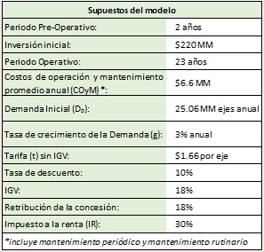 Para desarrollar el MODELO ECONÓMICO, el Estado de Resultados de la Concesión que considera los ingresos (sin IGV), los costos y gastos, por efectos de simplificación, el modelo no incorpora la Deuda, de hacerlo las conclusiones no cambiarían significativamente.