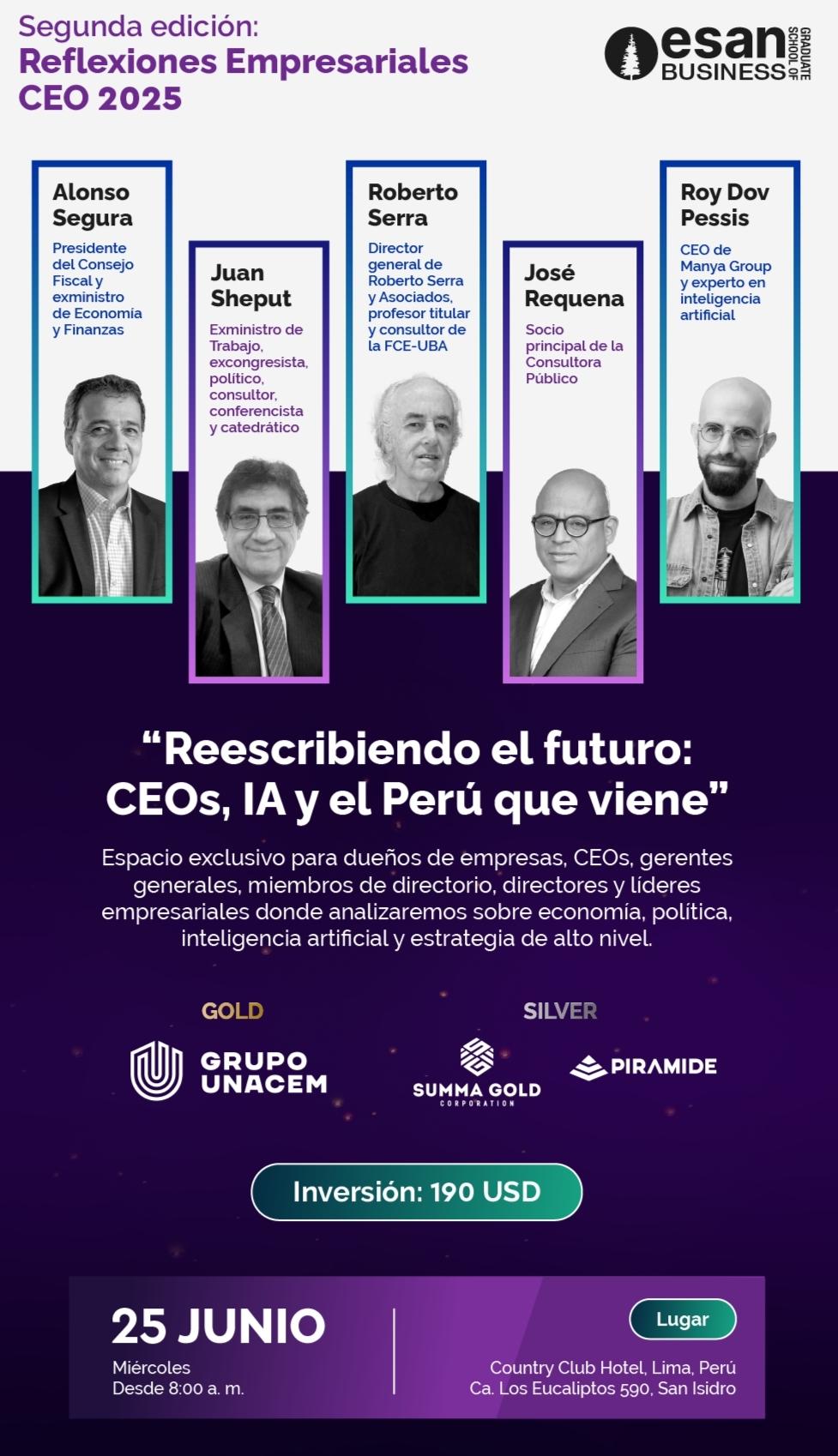 ESAN Graduate School of Business tiene el agrado de invitarlo a la segunda edición de Reflexiones Empresariales CEO 2025, que se llevará a cabo el miércoles 25 de junio en el Country Club Hotel, desde las 8:00 a.m.